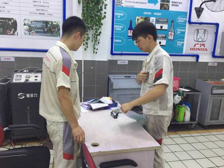 本次看望的毕业生是15级中德诺浩班的王杰、陈孝鹏,目前在海口中升宏达销售有限公司从事汽车维修岗位。