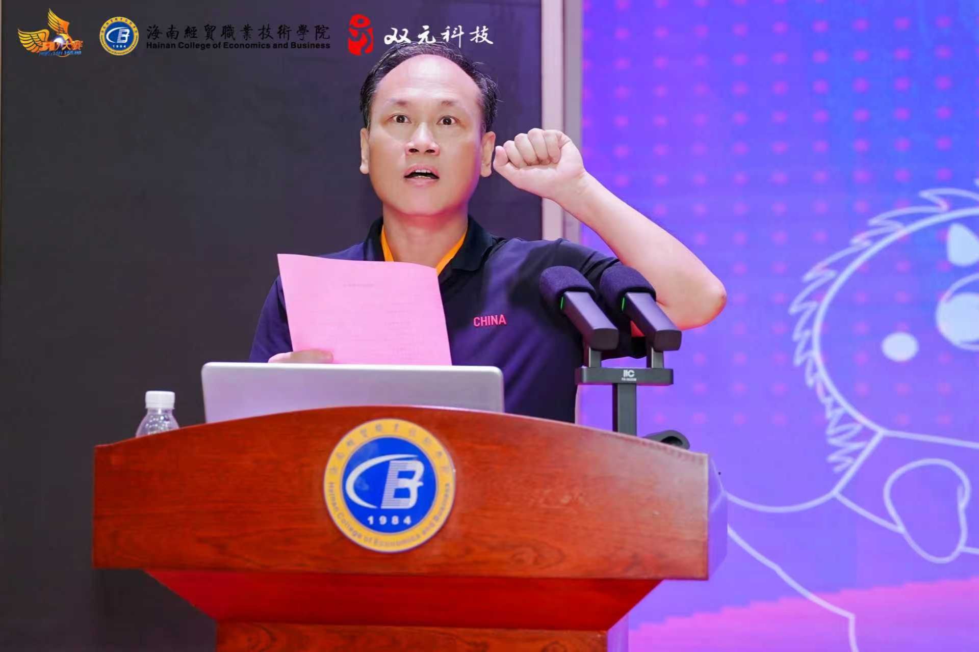 谭卓辉强调了大赛在培养数字化人才方面的重要意义,期待通过赛事促进海南产教融合,并鼓励选手积极交流、赛出水平。裁判员代表梁栋和参赛选手代表陈来烨庄严宣誓。
