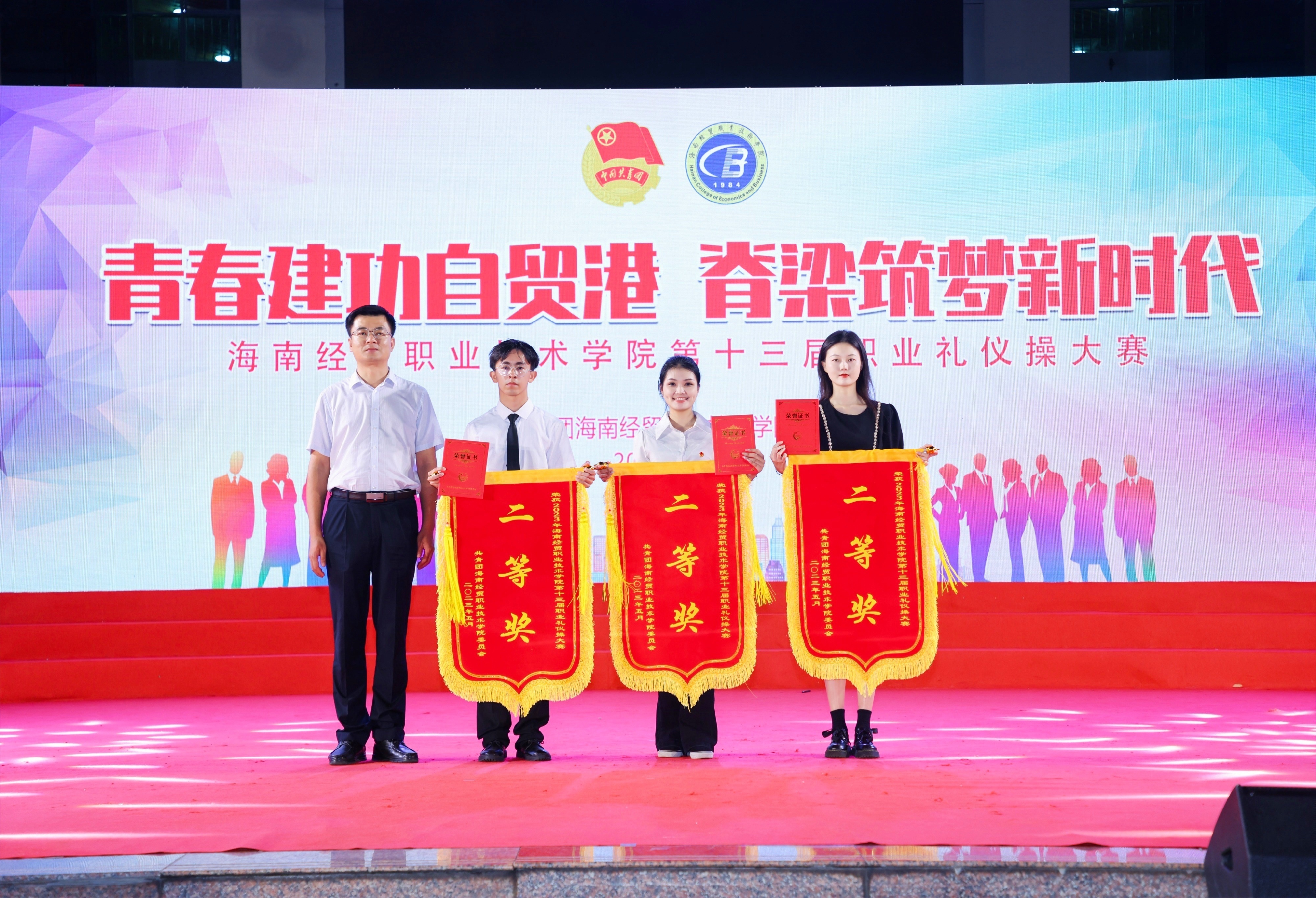 2023年5月4日晚,海南经贸职业技术学院第十一届职业礼仪操大赛在经贸广场举行。beats365亚洲版官网礼仪操代表队经过创新内容展示、礼仪操规定动作表演两个环节的综合评比得分,最终荣获二等奖。