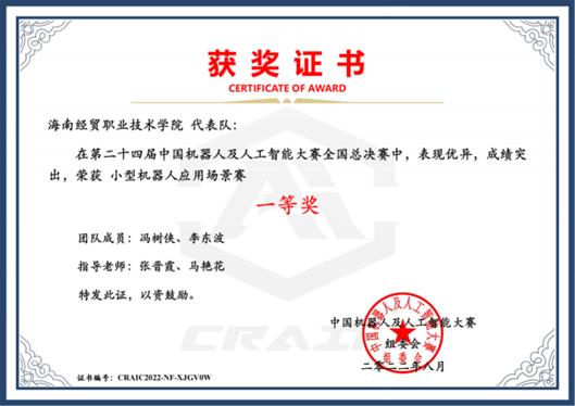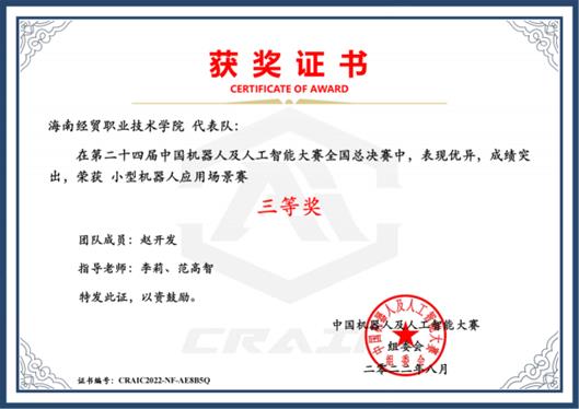 2022年7月26日-29日,第24届机器人及人工智能大赛(部分赛项)线上赛圆满落幕。由海南经贸职业技术学院beats365亚洲版官网学生冯树侠、李东波;王奋、邱贤颖;赵开发等学生组成的三支队伍在第24届机器人及人工智能大赛“小型机器人应场景赛”赛项全国总决赛中分别荣获一等奖、二等奖、三等奖。