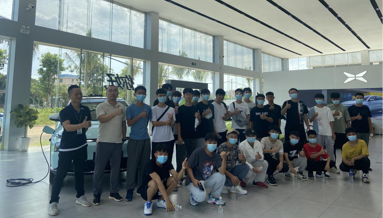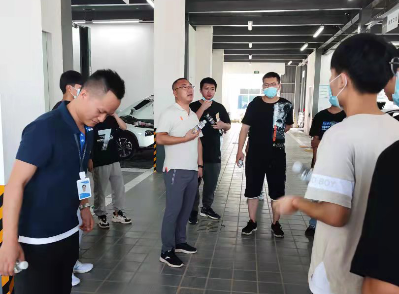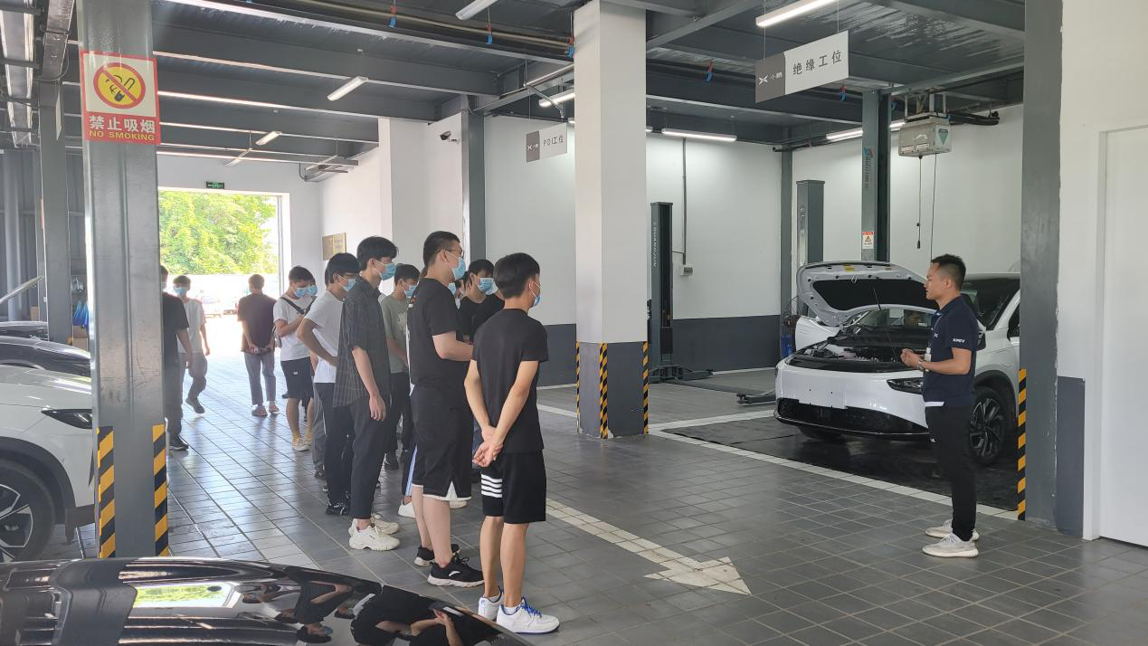 在小鹏汽车服务中心,售后服务部刘飞飞经理以学长的身份热情欢迎大家的到来,为同学们就小鹏品牌的发展战略及技术理念与优势做了详细的讲解,并带领同学们参观纯电动汽车售后服务车间。在车间,黄英超老师带领大家了解了维修车辆所用的各项设备和器材,并演示部分设备工具的使用方法和注意事项,结合生产实际对同学们的职业技能和职业素质的培养提出具体要求。
