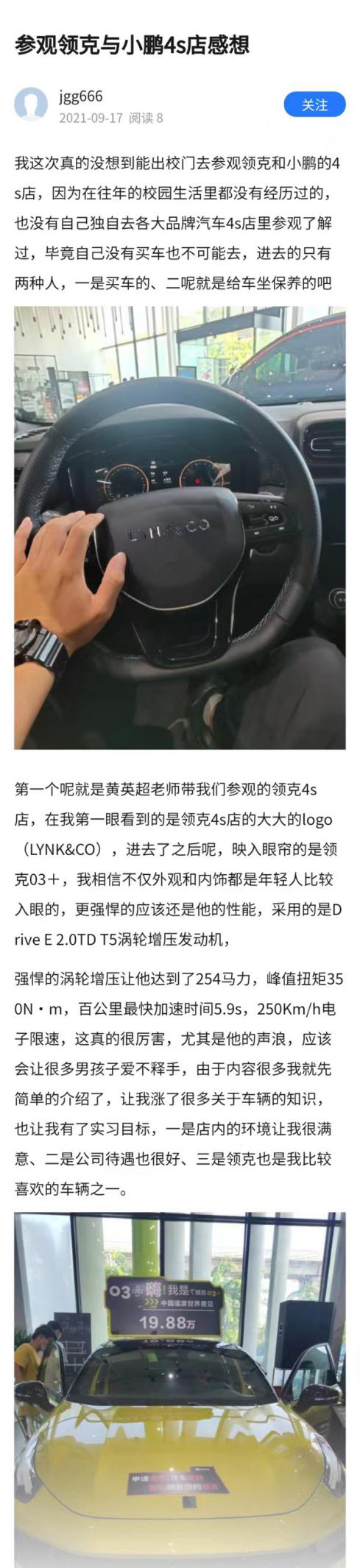 在合沃展厅内,销售部何子宁总监详细的给同学们介绍了领克品牌汽车的销售情况和销售员需具备的知识结构和技能素养。2020级正在店内顶岗实习的学长为学生们进行业务技能展示,介绍了领克产品的具体车型和参数并分享了实习的感受。
