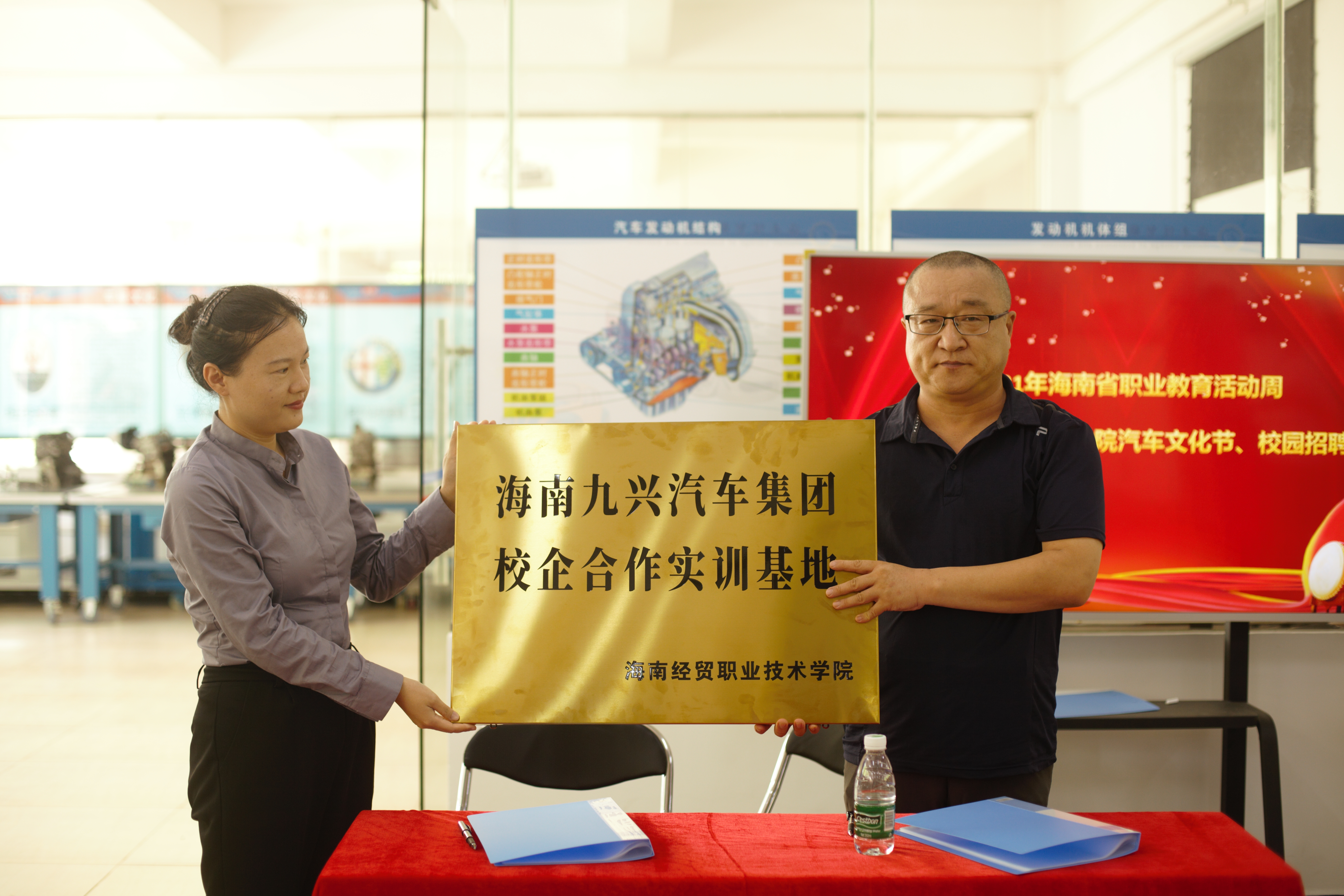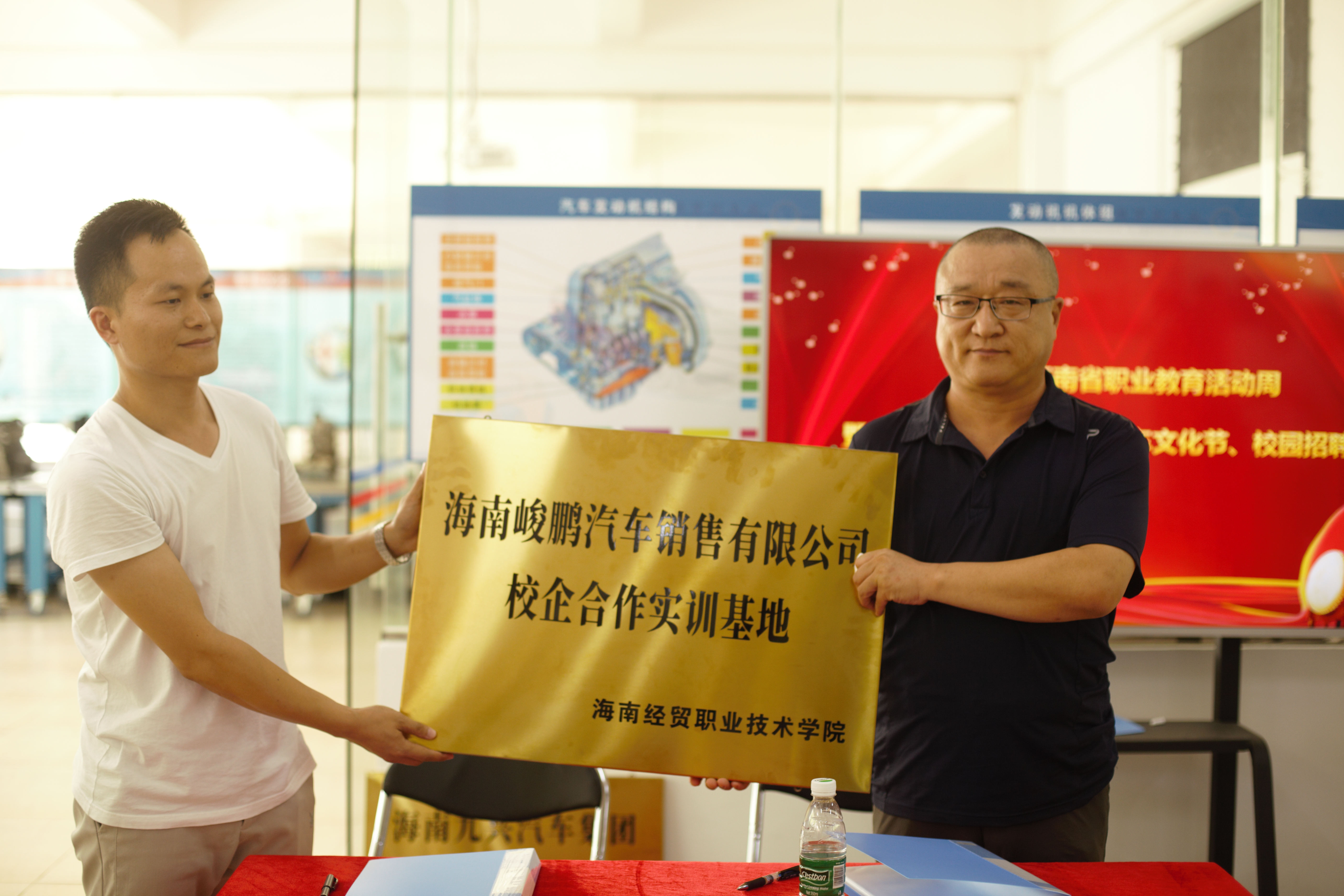 招聘会现场我院与海南峻鹏汽车销售有限公司和海南九兴汽车集团签订了校企合作协议,双方共同培养满足社会需求,以服务为宗旨,以就业为导向,以质量求生存,以创新促发展的产教融合教学理念。