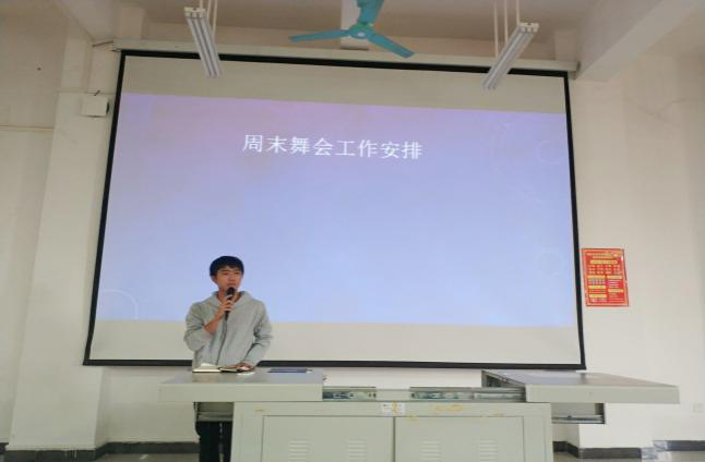 校运会工作总结结束后,副主席邓丕崧针对我院本月即将举办的周末舞会进行工作安排,邓丕崧首先对各部门进行舞会工作的分配及负责区域,最后要求团学青全体成员一定要相互协作,共同把周末舞会举办得更加精彩。