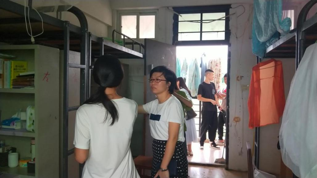 2019年9月1日(青年媒体中心报道)讯,已经正式进入新学期同学们回校注册的时间,在9月1日下午五点整,我院18级各班同学已陆续报道完毕,院党总支副书记陈亚芳与18级辅导员代晓明两位领导老师首次带领学院第19届团学青全体干部走访学生寝室,深入了解同学们的回校情况与入住情况。