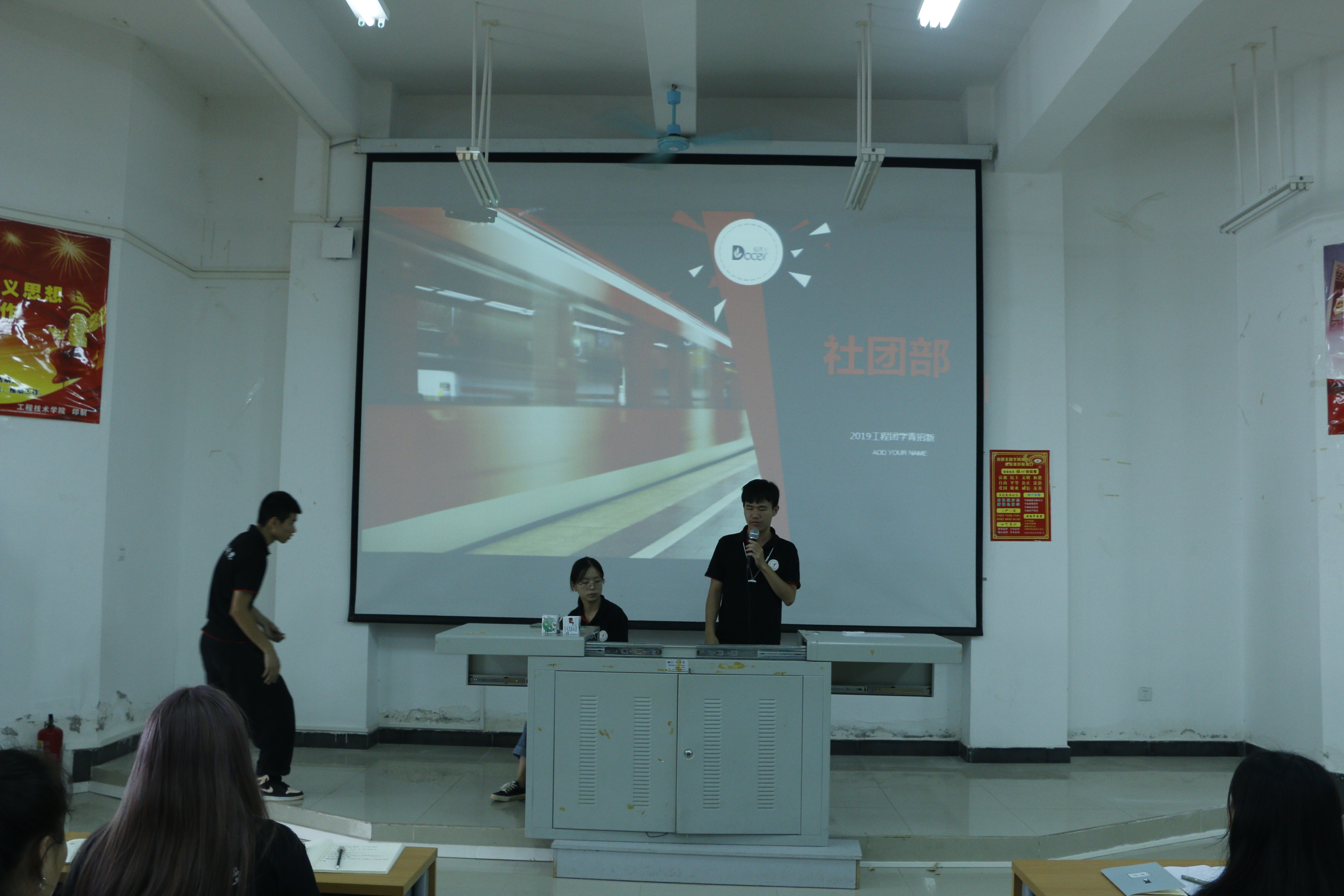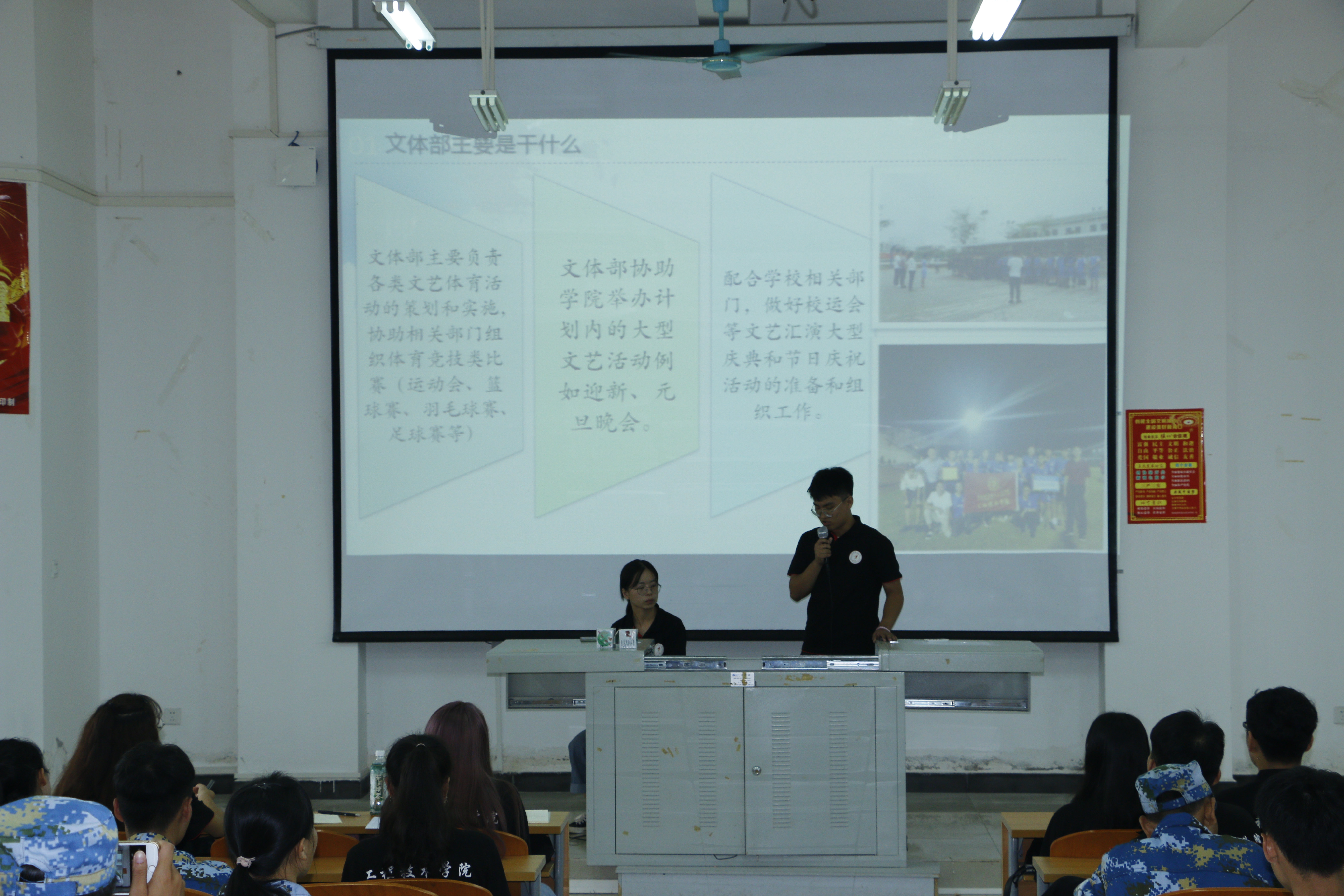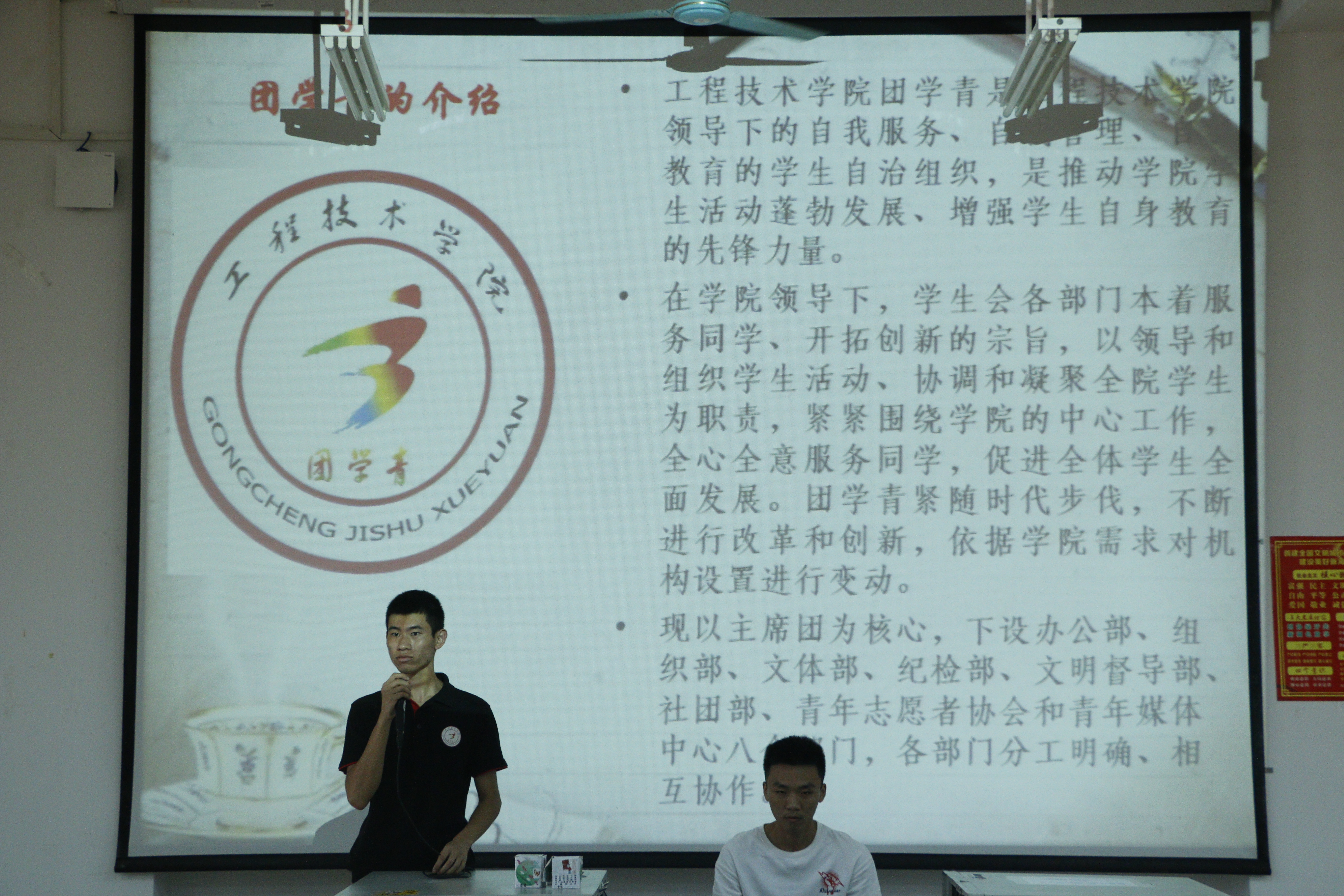 会议的开始由团学青主席叶俊男介绍团学青,随后各部门展示准备好的PPT介绍自己部门。介绍的结束,主席叶俊男介绍各部门的面试地点。面试时,同学们都普遍指出在学生会可以得锻炼,结交朋友,能够在团学青这个平台提升自己的能力,在大学里充实自己。同时各部门也准备不少问题来考验同学们,部分同学的回答也使部长们非常满意,使招生会议高潮不断。