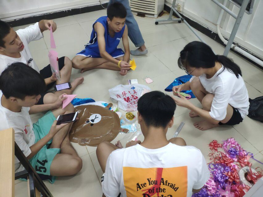 看,那些坐在地上同学们,他们正在构思着新的花样,他们不停地交流着,有时遇上难题时还会掏出手机百度看看有没有解决办法。大家一起动手其乐融融,为班级的文化布置工作奠定了最初的准备工作。看,同学们脸上露出的那一抹淡淡微笑,那是对新学期满满的期待和憧憬。教室里到处都能看到同学们忙碌的身影,忙得不亦乐乎。