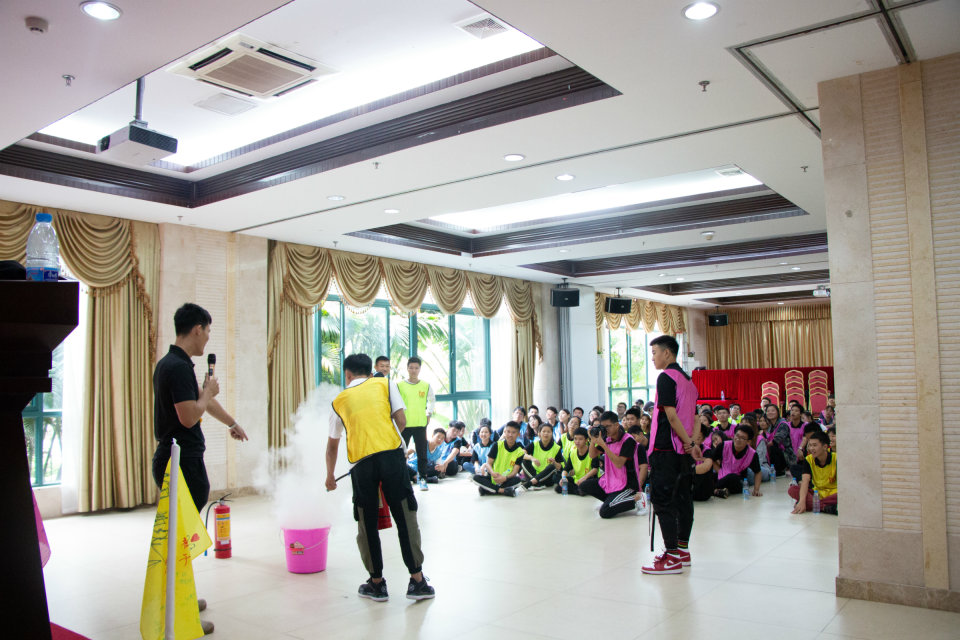 上午九点整,参加培训的学员准时在会议室集合,工程技术学院梁其钰老师对本次学习的目的和预期的目标作了简要说明,周恺老师强调了本次学习的纪律,接着梁老师带领所有学员对培训目标达成及纪律要求进行宣誓。为了充分调动学员的积极性,梁老师将在场的学员分成四组,并引入竞争机制,对团队协作项目能量传递、勇争先锋进行小组PK,有的小组在制定策略、团队沟通、任务执行上表现出色,分数领先,有的小组在执行力上有所偏差,分数相对落后,但所有小组都认真总结成功或不足的经验,并进行分享,相互的学习和交流产生了火花的碰撞,每个小组每个队员保持着最佳的战斗力。小组PK后,唐图老师对所有学员进行消防知识的普及,唐老师引用大学生使用违规电器导致宿舍失火的案例,迅速吸引了每位学员的注意力,接着实地演示灭火器的正确使用方法,部分学员学习并亲自体验了正确使用灭火器的流程,随后进行了安全消防知识竟答。