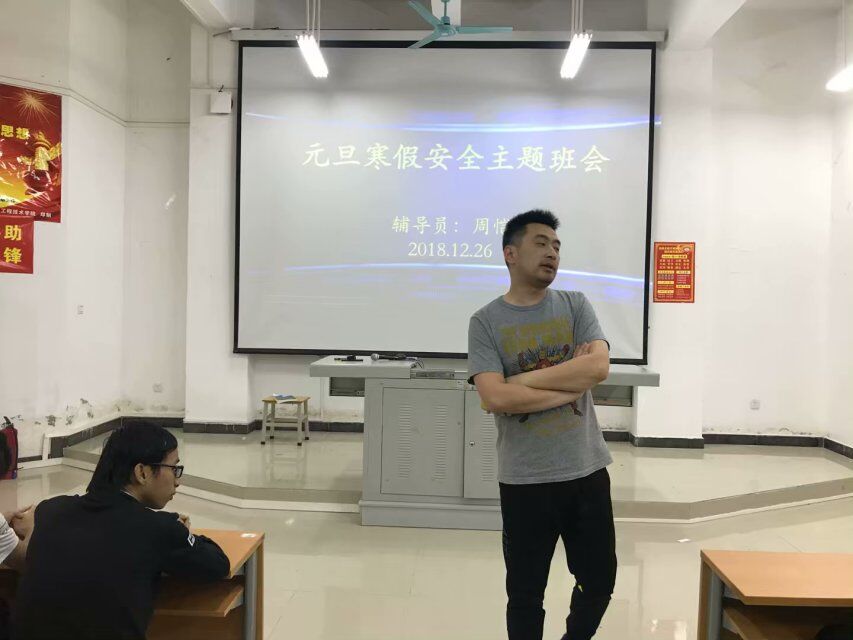 2018年12月26号晚(青年媒体中心报道)讯,我院在二教408教室积极开展了元旦寒假安全主题班会。本次会议由17级辅导员周恺主持召开,到场有17级全体学生。