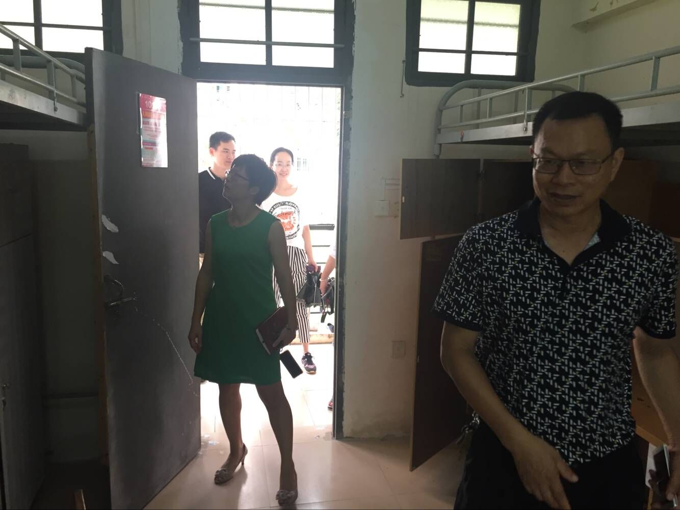 本次主要针对新生寝室逐一进行全方位检查,寝室有无安全隐患,门窗、床铺、桌椅是否完好,并认真做好寝室维修备案,准备上报后勤部门。目前还有一些宿舍没有清理出来,在检查中,辅导员周恺提到,针对宿舍上方的电风扇的清洗对于学生来说比较困难,希望通过宿管维护团队来帮助清洗,宿管老师也承诺会在暑假进行全方位的清理与维修。
