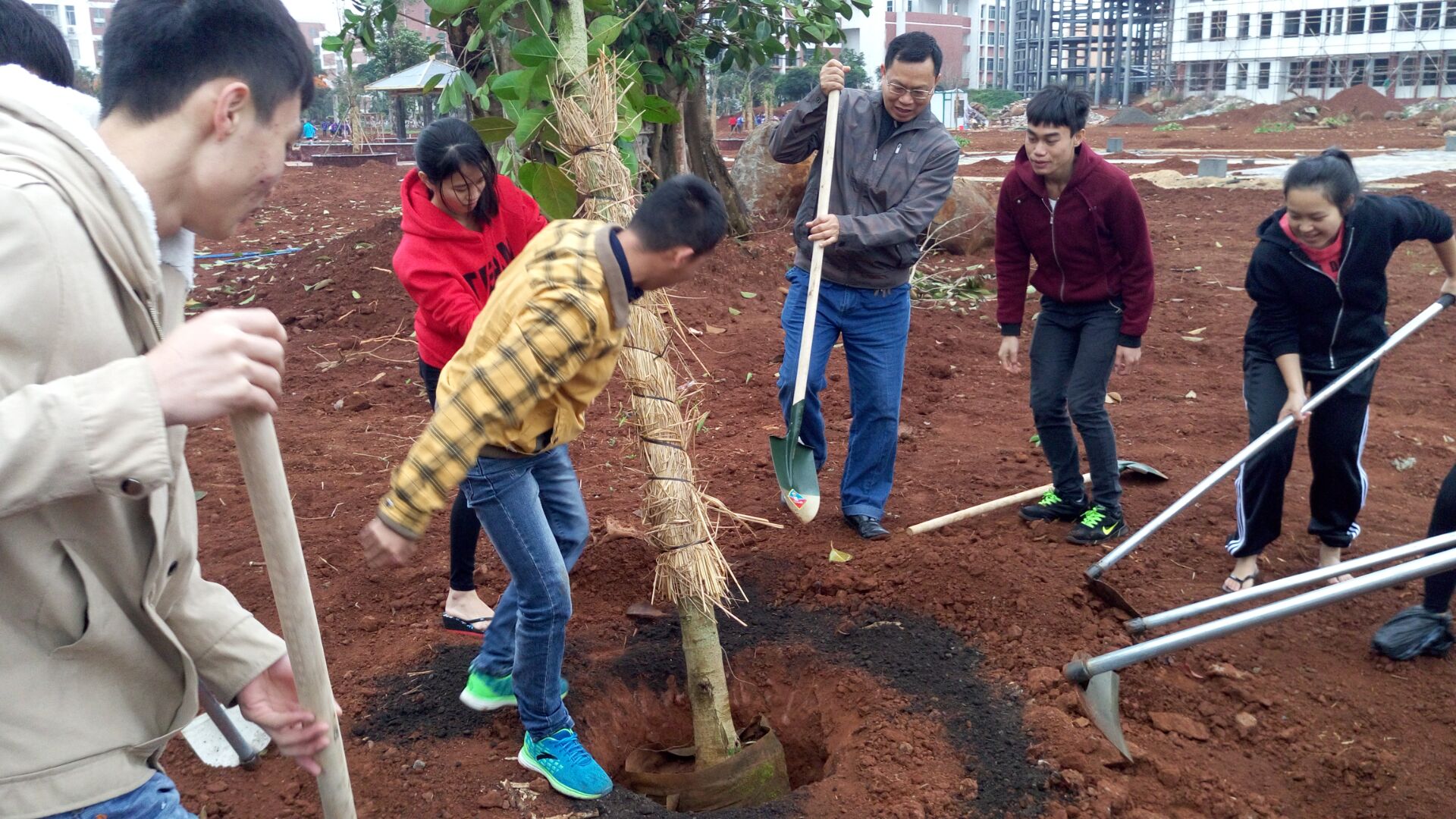 一到现场,老师和同学们便几个人一组,投身于植树活动中,尽管天空下着小雨,可是大家的激情未减,有的铲土挖坑、有的手扶树苗,有的填土压实,忙的不亦乐乎。一棵棵树苗在大家的相互配合下站直了身躯,大家脸上都洋溢着快乐的笑容,希望来年会绿树成荫。
