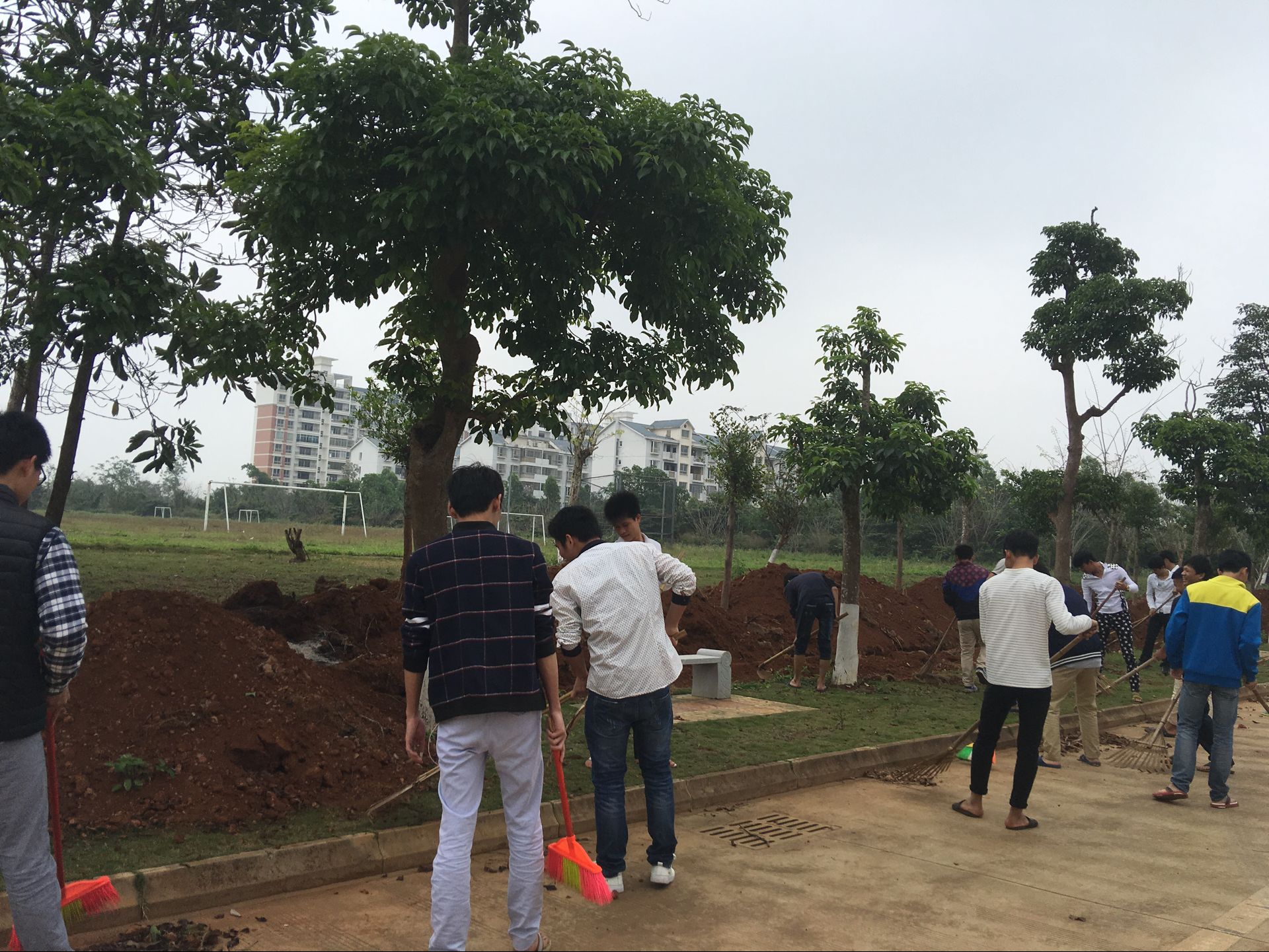 到达指定位置后,大家拿起扫帚、垃圾铲、垃圾桶等工具,有的扫地、有的拔草、有的捡垃圾,认真打扫路面以及草坪中的枯枝败叶,仔细清除“藏”在绿地中及路边的塑料袋、废纸屑、碎砖块等杂物,最后将垃圾运到路边的大垃圾桶里。学生们个个干劲十足,干得热火朝天,汗流浃背。经过大家的齐心协力,通过一两个小时的奋战,终于将指定的区域变得干净亮丽起来,看到焕然一新的环境,大家都乐呵呵的,并拿出手机拍照留念。