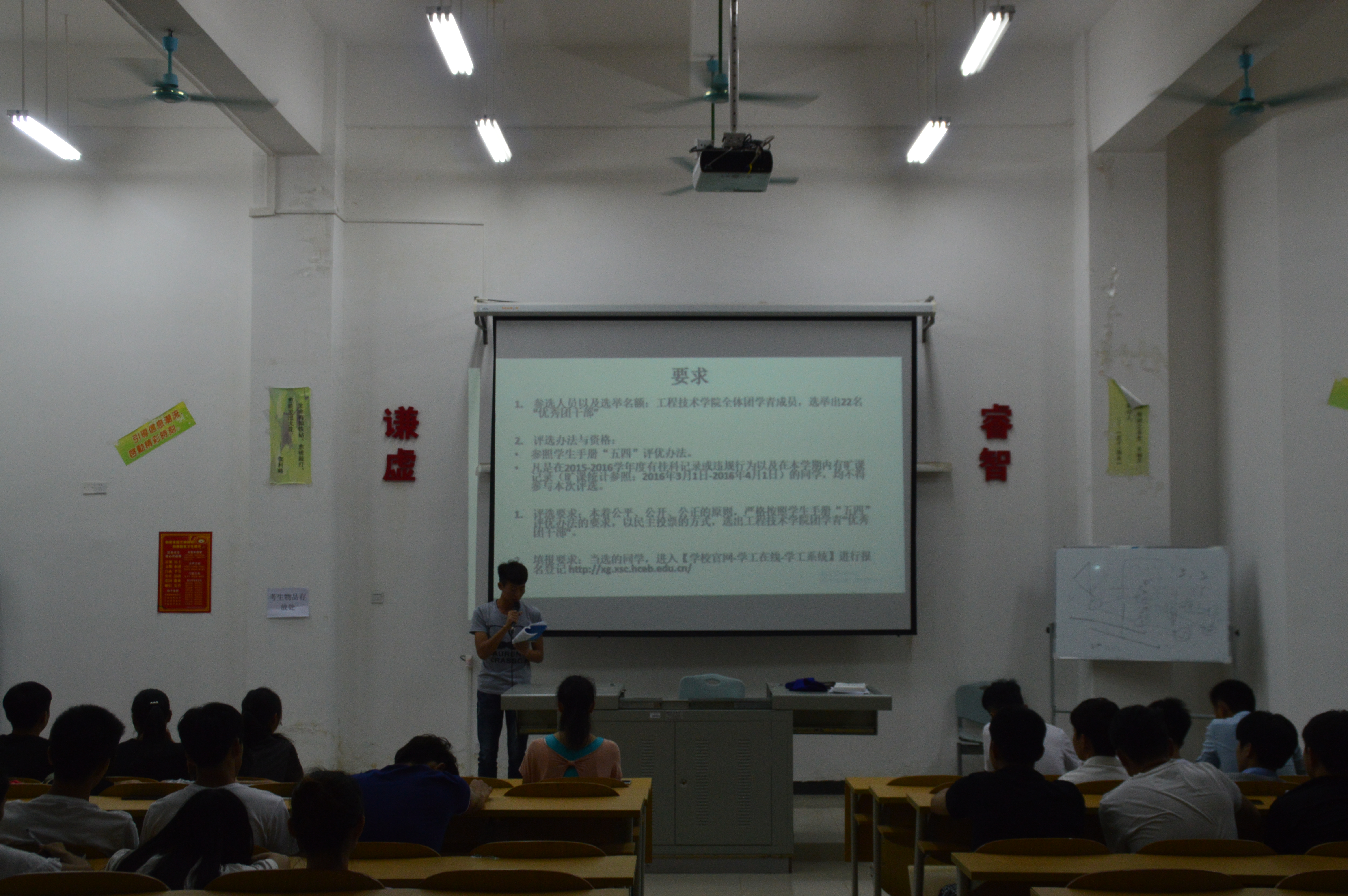 会议首先由代晓明老师宣读评选要求。本着公平、公正、公开的原则,严格按照学生手册“五四”评优办法要求,以民主投票的方式,选举出工程技术学院团学青优秀团干部。接着由副书记朱振通宣读学生手册“五四”优秀团干部要求。