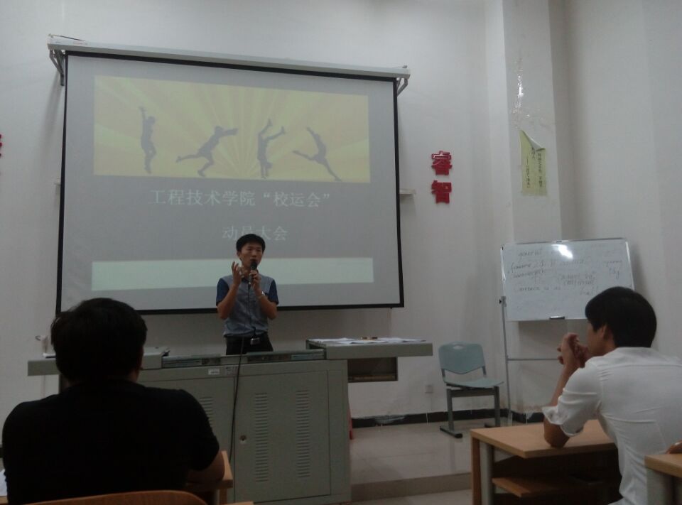 11月13日讯(工程技术学院 李京京报道) 11月12日晚7:30在二栋526多媒体教室举行了“工程技术学院校运会动员大会”。参加本次会议的有工程技术学院团学青负责人代晓明老师、学工办副主任梁其钰老师、团学青全体成员以及14、15届各班班长、体育委员。本次会议由副主席赵丽主持,会议在赵丽的开场白下拉开帷幕。