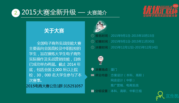 接着,李顾问对2015大赛中全新升级的品牌直营店、亲友团及比赛规则(初赛成绩=方案设计或网店建设20%+营销推广50%+电商实战< 销售额>30%;决赛总成绩=初赛成绩70%+决赛简报分析30%)、奖项设置(优优校园之星团队奖=50000+纪念品+证书;特等奖=10000+纪念品+证书<2 >;一等奖=5000+纪念品+证书<6 >;二等奖=3000+纪念品+证书<27 >)、创业基金(免息贷款、多企联合、基金管理、基金申请)、品牌支持(厦门乐麦电子商务有限公司、厦门米推信息技术有限公司、厦门安泰迪智家居有限公司、食养臻品、兰亭科技股份有限公司、厦门久享信息科技、厦门优之点投资有限公司、惠博贸易、一泰.酷家)、货源支持进行了讲解说明。