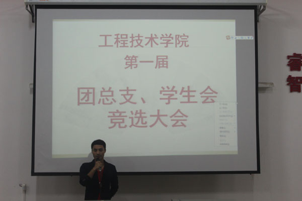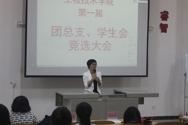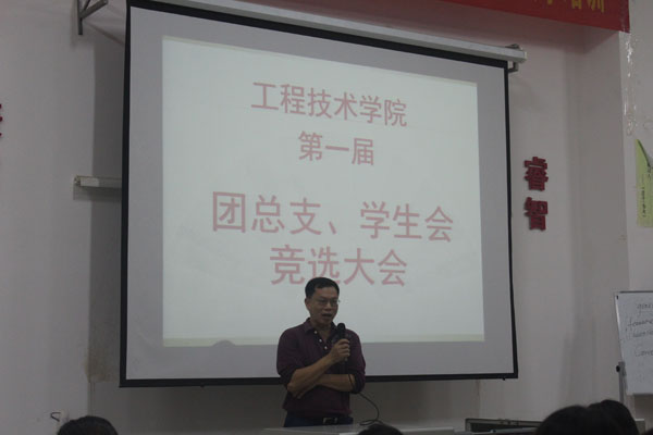 10月13日讯(工程技术学院 李京京报道)12日晚19:30在2栋526多媒体教室举行了“工程技术学院第一届团总支、学生会竞选大会”。本次会议出席的嘉宾有工程技术学院党总支书记陈继敏书记、学工办主任陈亚芳老师、学工办副主任梁其钰老师、教学秘书龙腾老师,导员刘芳老师、肖洁老师,团学负责人代晓明老师,团总支学生会全体成员及有兴趣参加竞选的同学。本次会议由代晓明老师主持,会议在代晓明老师的开场白下拉开了帷幕。