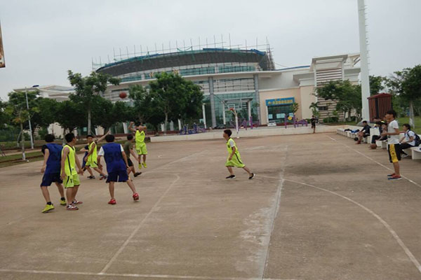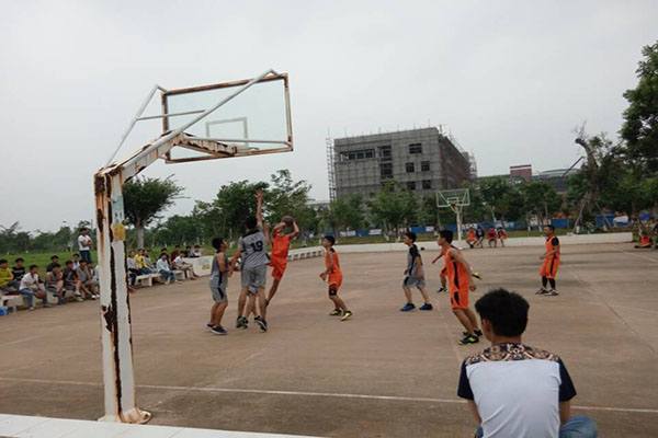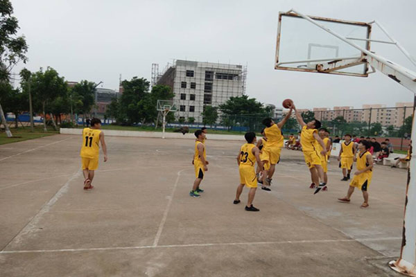 裁判员的口哨声下,双方队员应声跳起争球,比赛正式开始。各班队员们个个情绪高涨,对战双方都不甘示弱,你争我夺每一个投球的机会,充分发挥了在身高、技术、速度、配合上的优势,同时赛场下的同学们也热情高涨,为自己班的队员们加油助威,此刻将整场篮球赛推向了高潮。