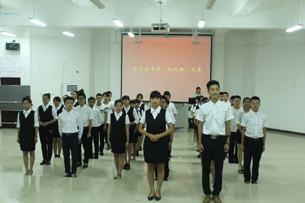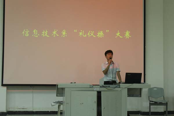 4月28日讯(信息技术系 李京京报道) 为了培养学生们文明、诚信、有礼貌的良好形象,弘扬礼仪风采,本系特于4月27日晚19:30在2-408多媒体教室举行了信息技术系“礼仪操”大赛。本次大赛由系内14级五个班级参加。本次评委邀请了我系学工办主任陈亚芳老师、学工办副主任梁其钰老师、14级辅导员龙腾老师、电子商务专业负责人单继周老师、马红老师。在秘书长丁燕琴的主持下,文明礼仪操比赛拉开了帷幕。