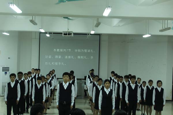 比赛班级按抽签顺序依次上台表演。随着舒缓的节奏声响起,同学们分别演绎着整装礼、站姿、蹲姿、递接礼、鞠躬礼、手势礼、握手礼等七个环节的过程。大家个个动作都熟练精湛、整齐规范,姿态优雅动人,精彩的表演赢得了评委及台下同学们的热烈掌声。最后通过评委们的评分,评选出14电商1班一等奖,14电商2班二等奖,14网络2班三等奖,14网络1班优秀奖 。